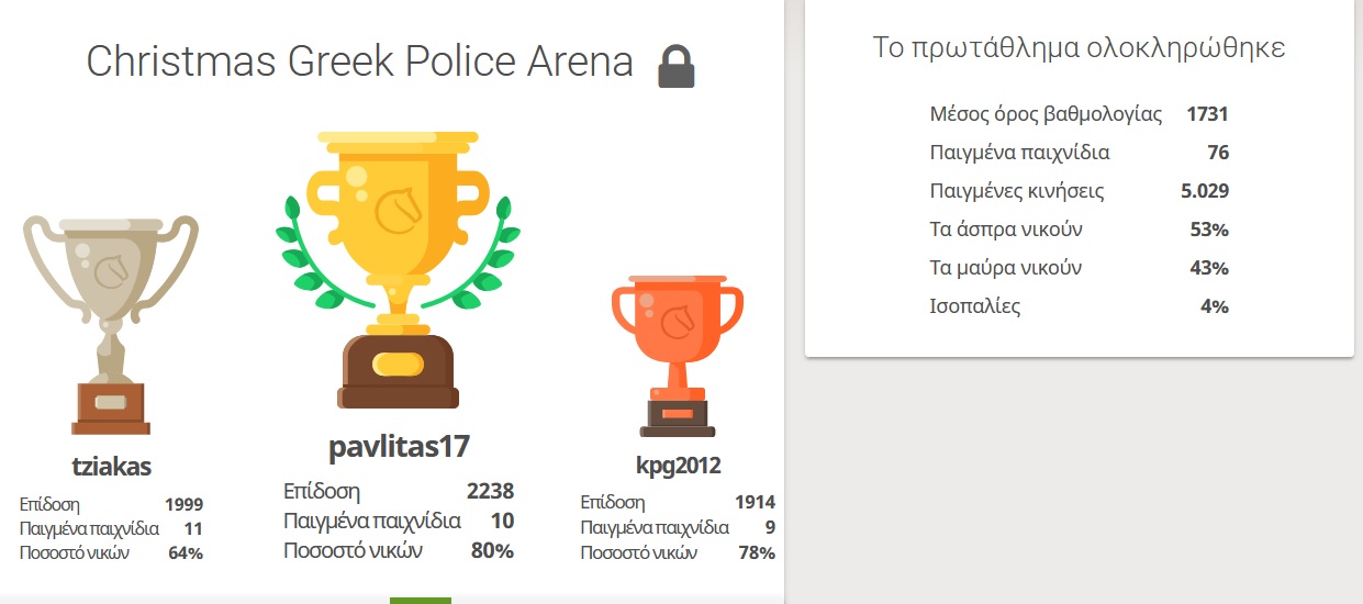 Με μεγάλη χαρά ανακοινώνουμε την επιτυχημένη διεξαγωγή του 1ου Διαδικτυακού Χριστουγεννιάτικου Τουρνουά Σκάκι αστυνομικών από την Πρωτοβουλία Αστυνομικών!